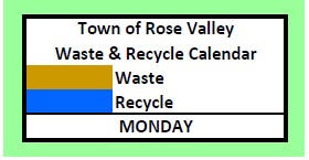 The Town of Rose Valley provides garbage and recycling service to residents with collection by Greenland Waste on Mondays. The service is alternating with garbage collection one week and recycling collection the next week. The service is billed for quarterly on the utility bill residents receive from the Town.